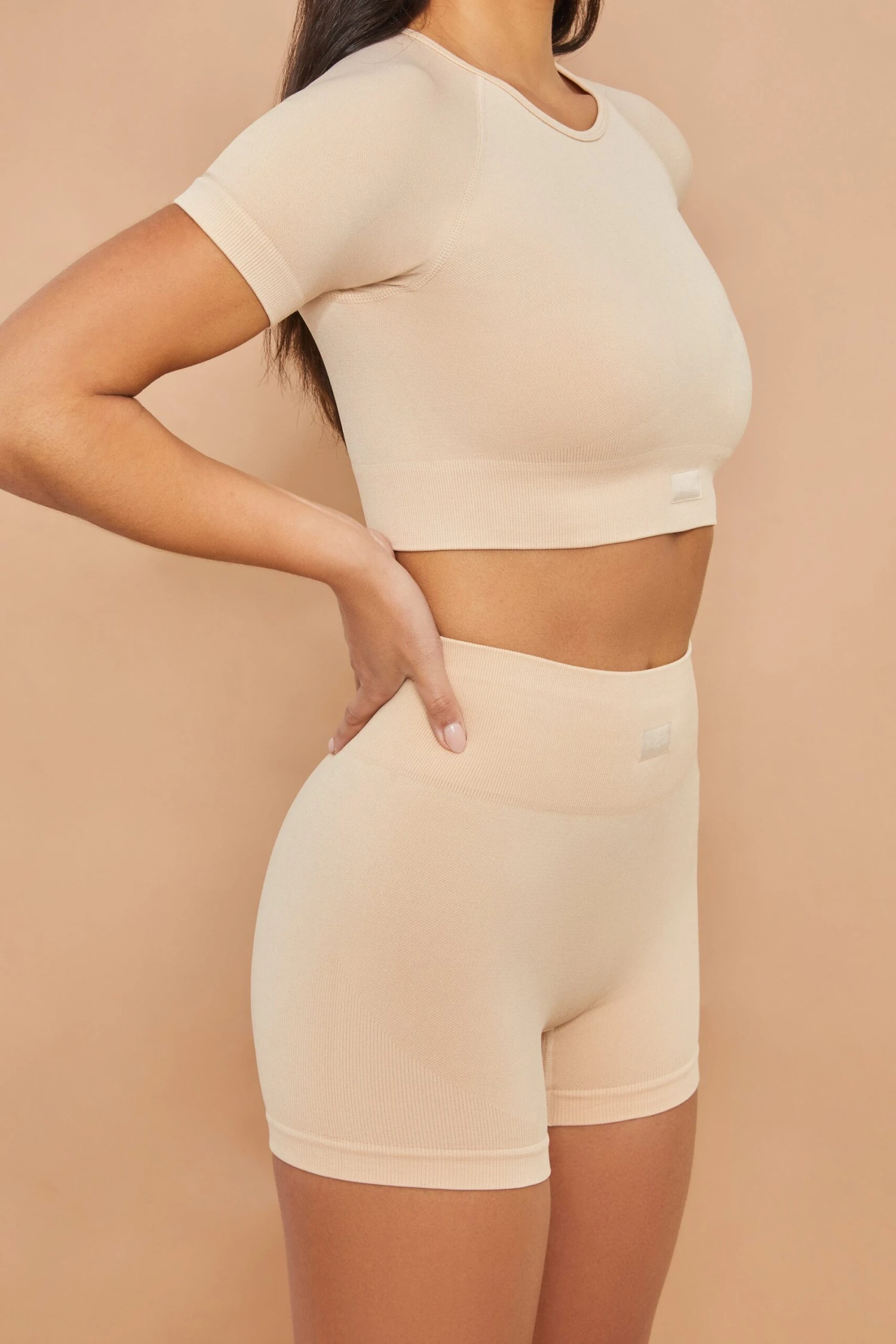 Our smooth, seamless knit mini shorts will give you all the confidence you need to smash your next workout. Cut to a figure-enhancing high waist with supportive ribbed waistband, these neutral coloured gym shorts fit close-to skin ensuring youÂ’re free to move however you want. Session complete.
