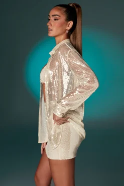 Party season isn’t complete without sequins and the Stella oversized shirt is the perfect piece to complete your festive look. Designed in our premium mesh fabric with flat sequin overlay, Stella is a classic shirt silhouette reinvented for the party season. Semi sheer and oversized for a comfortable and flattering fit, Stella is complete with functional button fastenings and a folded collar.