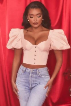When it’s jeans and a nice top for date night, we’ve got you covered. Heavenly crop top is styled with exaggerated short puff sleeves and a frame shaping, square and sweetheart style neckline to flatter your bust. Finished with our favourite structured boned corset bodice and silver hardware fastenings, our shining woven fabric completes this crop top for a premium look and feel.