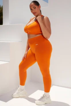 Power forward in Surge full length leggings. Designed in our all-new lightweight seamless knit fabric that moves with you, our deep orange gym leggings are complete with a curved secure ribbed waistband for non-slip support and accentuating ribbed shaping to the rear. Paired with the matching crop top or sports bra, these smooth workout leggings were made for supercharged sessions.