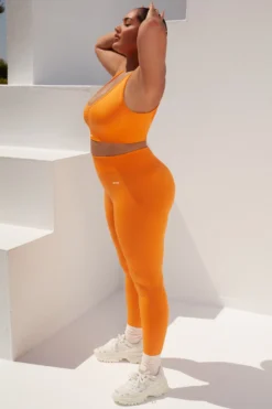 Power forward in Surge full length leggings. Designed in our all-new lightweight seamless knit fabric that moves with you, our orange gym leggings are complete with a curved secure ribbed waistband for non-slip support and accentuating ribbed shaping to the rear. Paired with the matching crop top or sports bra, these smooth workout leggings were made for supercharged sessions.