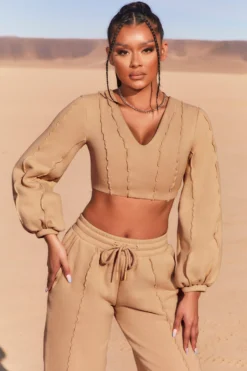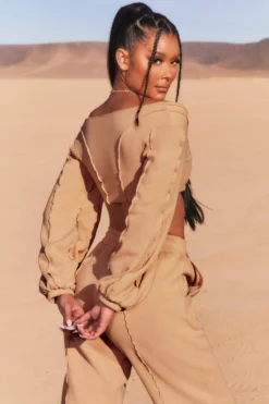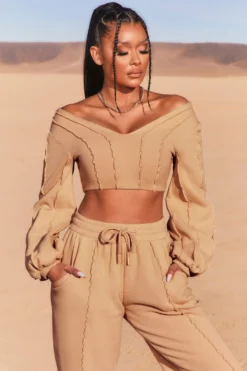 Uncover a new you, babe, in our bardot crop top. Styled in an off the shoulder cut with long, voluminous balloon sleeves and stretch cuffs for added drama, our cropped top in smooth, premium cotton is complete with exposed seam detailing for extra edge. Paired with the coordinating joggers and subtle gold jewellery, this look was made to be unveiled asap, honey.