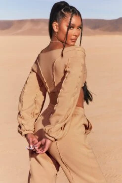 Uncover a new you, babe, in our bardot crop top. Styled in an off the shoulder cut with long, voluminous balloon sleeves and stretch cuffs for added drama, our cropped top in smooth, premium cotton is complete with exposed seam detailing for extra edge. Paired with the coordinating joggers and subtle gold jewellery, this look was made to be unveiled asap, honey.