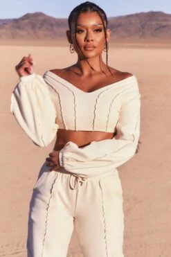 Uncover a new you, babe, in our bardot crop top. Styled in an off the shoulder cut with long, voluminous balloon sleeves and stretch cuffs for added drama, our cropped top in smooth, premium cotton is complete with exposed seam detailing for extra edge. Paired with the coordinating joggers and subtle gold jewellery, this look was made to be unveiled asap, honey.