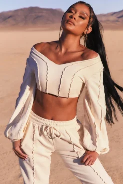 Uncovered Exposed Seam Bardot Crop Top In Ivory
