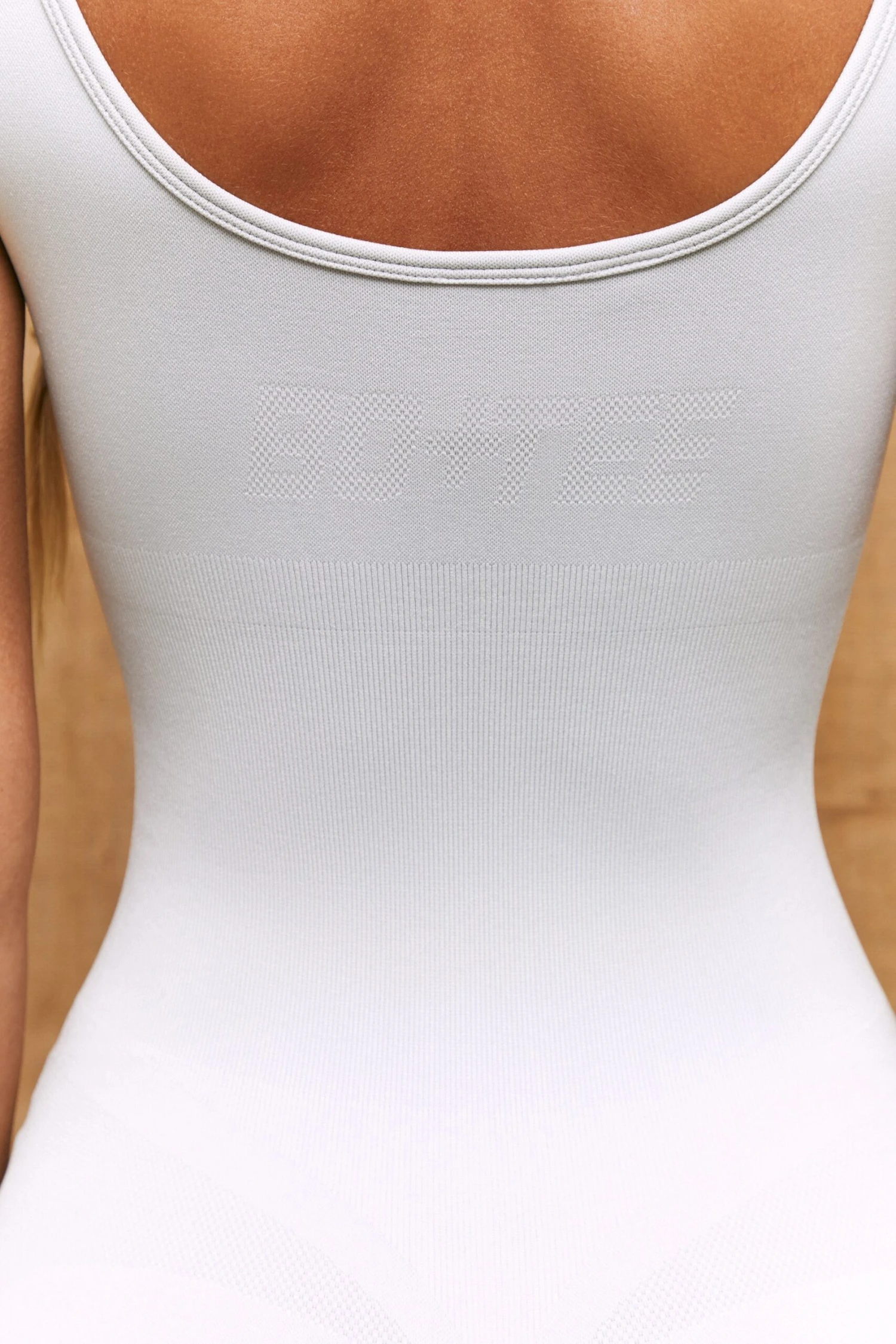 LetÂ’s see how far you can push yourself in our new seamless unitard. Designed in premium stretch knit fabric with textured shading creating body-mapping contouring throughout, our short playsuit is cut sleeveless and features a scooped neckline with sporty zip front. Soft and stylish, weÂ’re redefining our goals in this neutral playsuit.